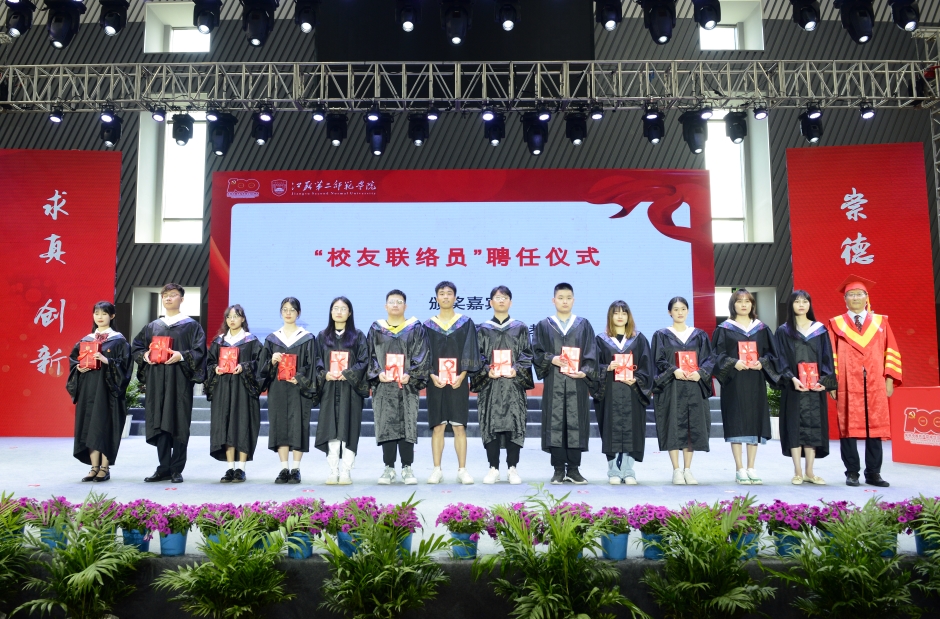副校长祝兴成宣读2021届优秀毕业生表彰决定与2021届校友联络员聘任决定。王仁雷、薛凤冠为获奖学生代表颁发证书,王建为校友联络员代表颁发聘书。