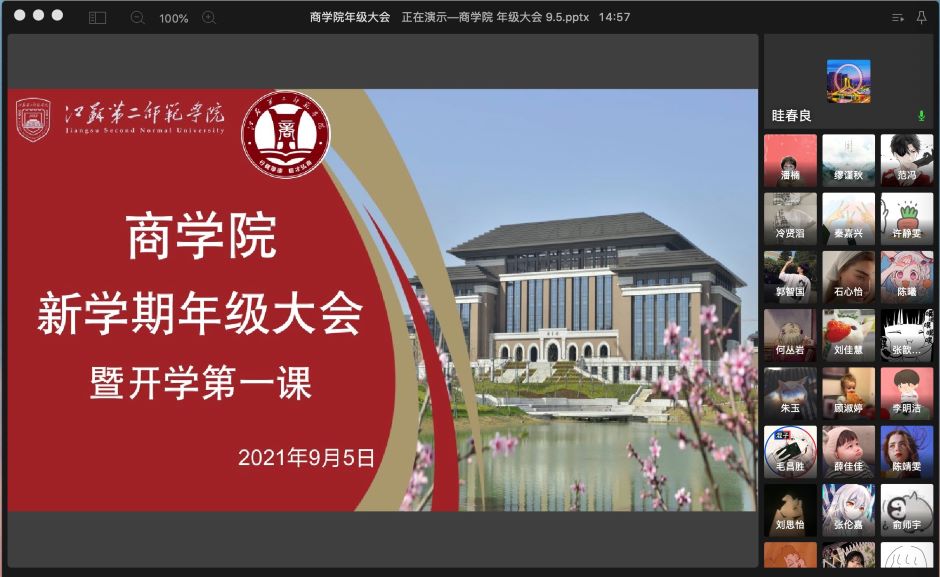 为进一步加强广大学生的爱国主义教育和安全意识教育,并做好开学线上教学的动员工作,9月5日下午,商学院举行新学期线上年级大会暨开学第一课。院党总支书记眭春良主持会议,副院长张敏出席会议。2019级、2020级全体学生参加会议。