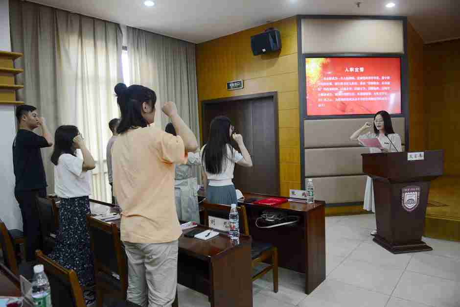 新进教师代表朱晗骐带领全体新进教师进行了庄严的入职宣誓仪式,铿锵的誓言表达了他们履行教书育人职责、献身教育事业的决心。