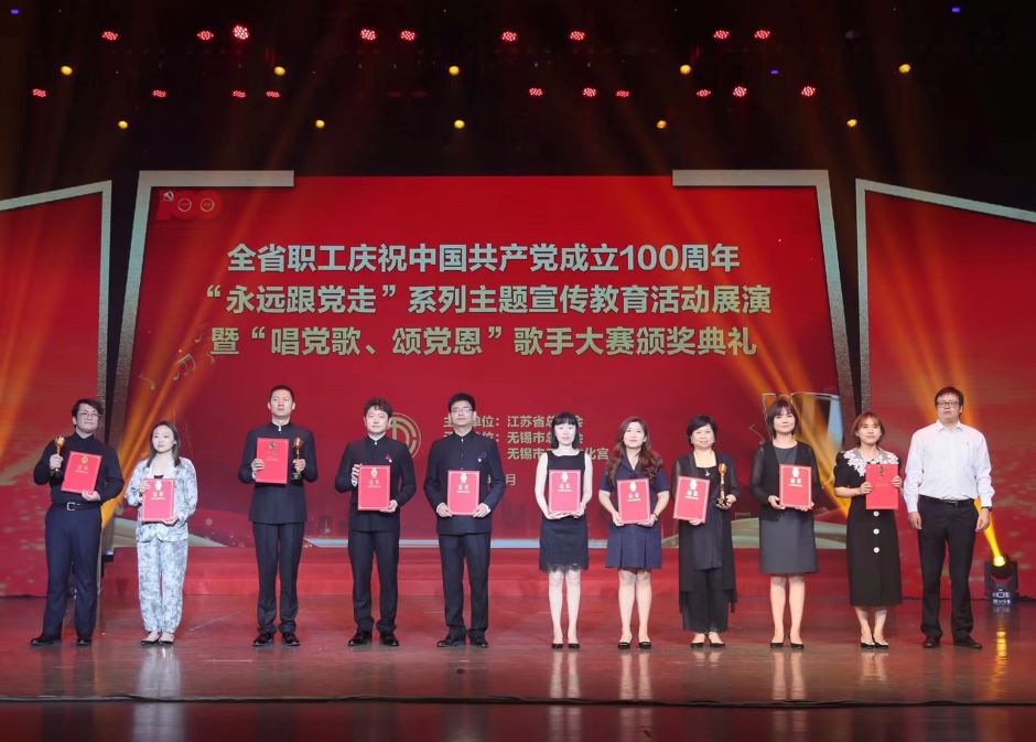 近日,江苏省职工庆祝中国共产党成立100周年“永远跟党走”系列主题宣传教育活动展演暨“唱党歌、颂党恩”歌手大赛在无锡隆重举行。我校T.N.T组合吴迪、韦利军、张想三位老师以作品《我们的新时代》荣获本次大赛铜奖。