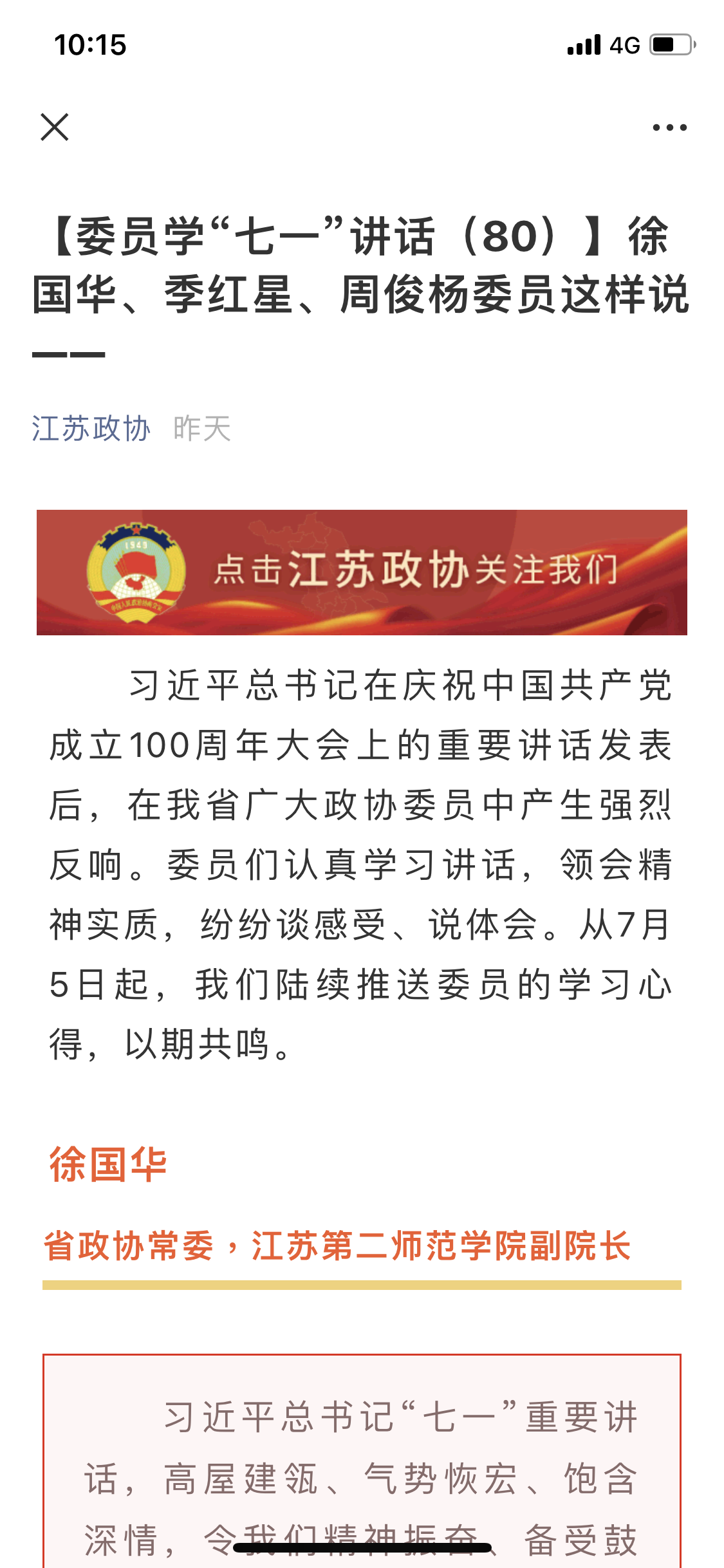 习近平总书记在庆祝中国共产党成立100周年大会上的重要讲话发表后,在我省广大政协委员中产生强烈反响。委员们认真学习讲话,领会精神实质,纷纷谈感受、说体会。从7月5日起,我们陆续推送委员的学习心得,以期共鸣。