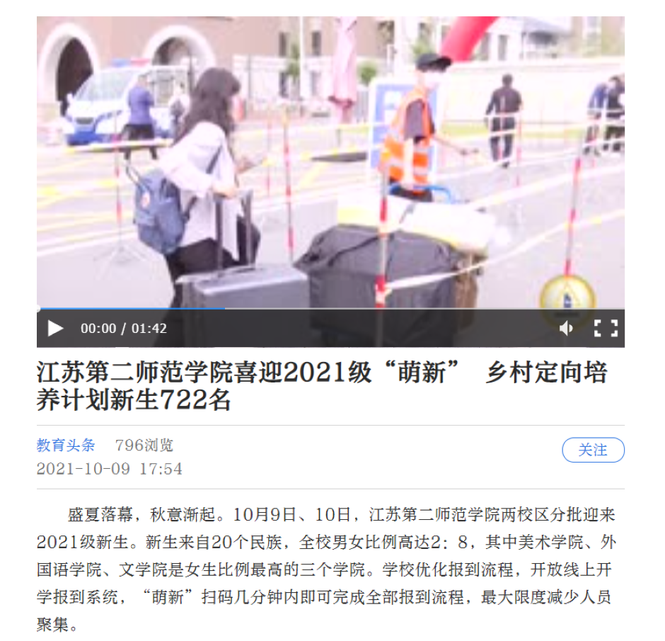 盛夏落幕,秋意渐起。10月9日、10日,江苏第二师范学院两校区分批迎来2021级新生。新生来自20个民族,全校男女比例高达2:8,其中美术学院、外国语学院、文学院是女生比例最高的三个学院。学校优化报到流程,开放线上开学报到系统,“萌新”扫码几分钟内即可完成全部报到流程,最大限度减少人员聚集。