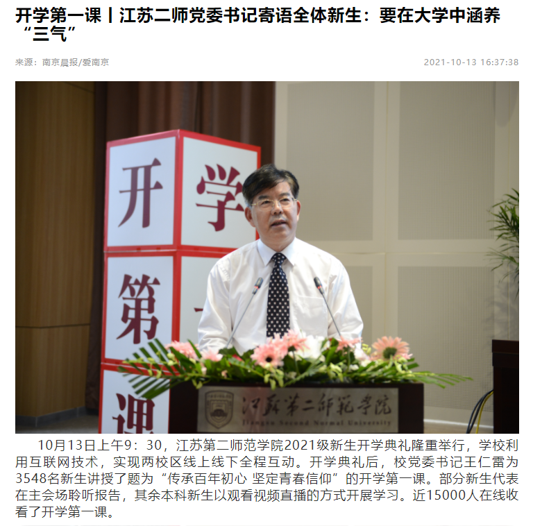 10月13日上午9:30,江苏第二师范学院2021级新生开学典礼隆重举行,学校利用互联网技术,实现两校区线上线下全程互动。开学典礼后,校党委书记王仁雷为3548名新生讲授了题为“传承百年初心 坚定青春信仰”的开学第一课。部分新生代表在主会场聆听报告,其余本科新生以观看视频直播的方式开展学习。近15000人在线收看了开学第一课。
