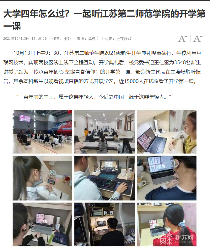 10月13日上午9:30,江苏第二师范学院2021级新生开学典礼隆重举行,学校利用互联网技术,实现两校区线上线下全程互动。开学典礼后,校党委书记王仁雷为3548名新生讲授了题为“传承百年初心 坚定青春信仰”的开学第一课。部分新生代表在主会场聆听报告,其余本科新生以观看视频直播的方式开展学习。近15000人在线收看了开学第一课。
