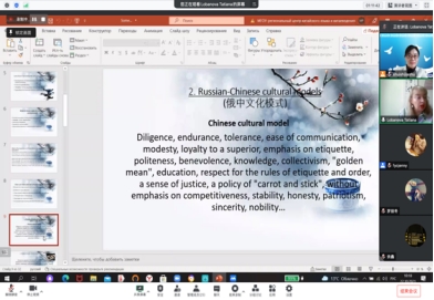 10月22日下午,“和平、发展、合作”主题活动框架下的专家系列讲座首讲在线上举行。莫斯科州国立大学博士、莫斯科州国立大学与我校共建的“汉语暨中国研究中心”主任、莫斯科州国立大学东方语教研室副教授拉巴诺娃·塔季扬娜女士作题为《中俄跨文化交际的问题与前景》的讲座。