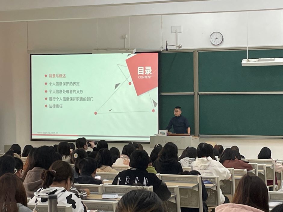 10月27日,我校邀请3位业界安全专家进行主题讲座,介绍网络安全案例、网络安全防护知识,并解读个人信息保护法。讲座期间,同学们积极参与、踊跃发言。讲座中的有奖竞答环节,使同学们在趣味环境中学习网络安全知识,提升网络安全意识,增强个人信息保护和防范诈骗能力,从而大力营造清朗的网络环境,共同维护国家网络安全。