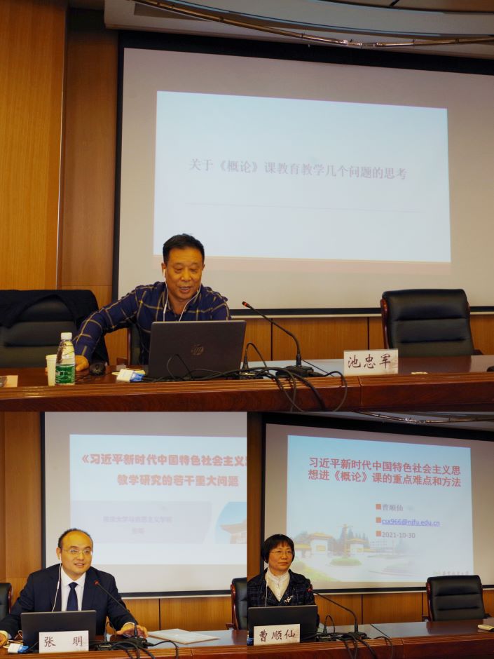 中国矿业大学池忠军教授以“关于概论课教育教学几个问题的思考”为题进行全面讲解,南京林业大学曹顺仙教授以习近平新时代中国特色社会主义思想进《概论》课的重点、难点和方法为切入点进行详细解读,南京大学张明教授以“习近平新时代中国特色社会主义思想教学研究的若干重大问题“为题作报告。参会教师分成四组进行研讨交流并就教学中的相关问题展开热烈讨论。