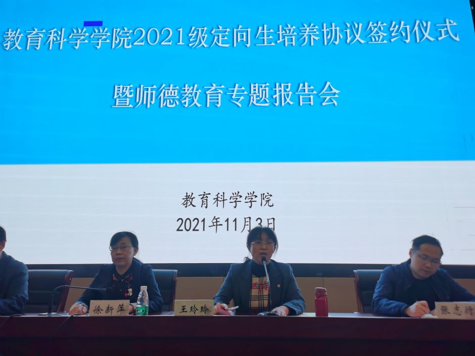 11月3日下午,教育科学学院在石湫校区图书馆报告厅举办21级定向生培养协议签约仪式暨师德教育专题报告会。教务处处长徐新萍出席活动。该院党总支书记王玲玲主持活动。