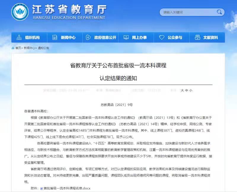 近日,省教育厅发布了《关于公布首批省级一流本科课程认定结果的通知》(苏教高函〔2021〕9号),我校共14门课程被认定为省级一流本科课程(名单如下),其中儿童文学、中国古代文学、现代自然地理学、计量经济学、英语课程与教学论、场地调查方法训练课程等6门课程被推荐参加国家级一流课程评选,立项和推荐数量在同类高校中较为突出。