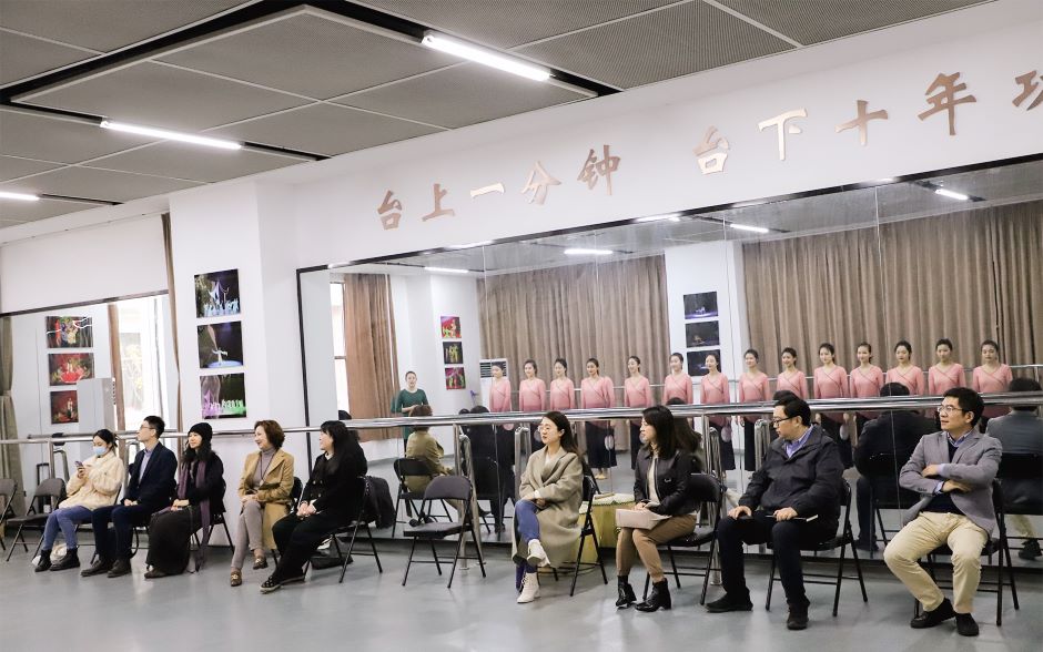 专家组一行赴尚美楼查看了艺术团训练场馆和在建的戏曲博物馆,参观了相关工作的现场教学、社团排练和艺术工作坊,并组织学生座谈,深入了解基地建设和公共艺术课程在校实施情况。