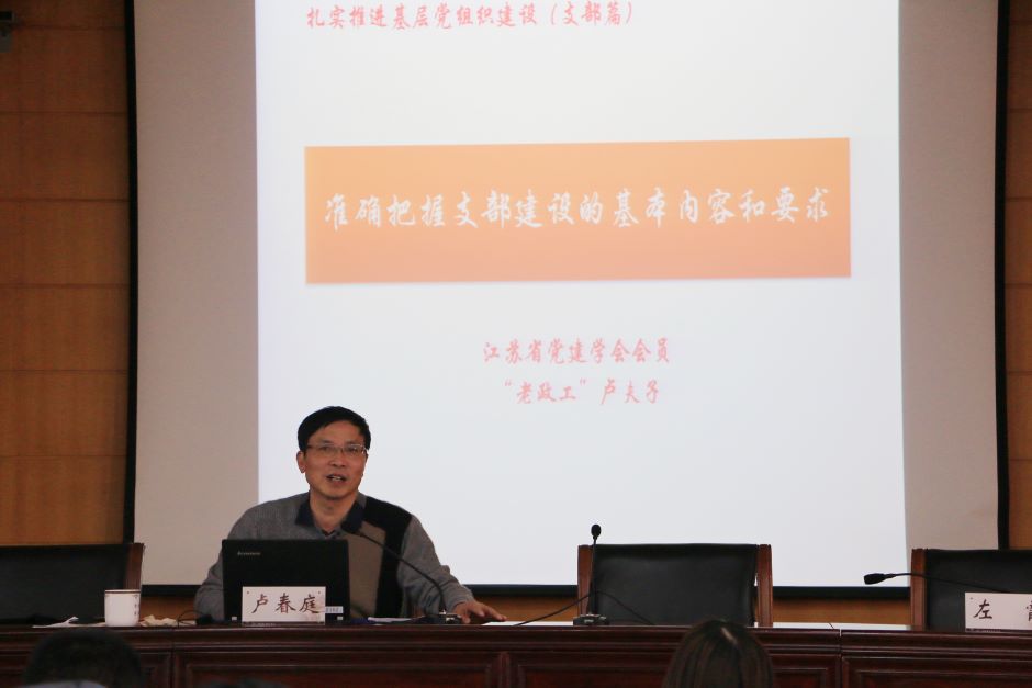 田军作了题为《高校基层党支部书记能力素质需求及其提升途径》的专题讲座,他从党支部书记的作用和职责、党支部书记如何处理好与行政领导的关系、党支部书记应具备的基本素质、如何做好支部书记以及党支部书记的工作方法等方面展开阐述。卢春庭作了题为《准确把握支部建设的基本内容和要求》专题讲座,他从清醒地认识到支部建设的重要性紧迫性,准确地把握《支部工作条例》的内容和要求,认真、规范、务实地推进基层党的建设三个方面作了精彩阐述,讲座现场气氛热烈、掌声不断。