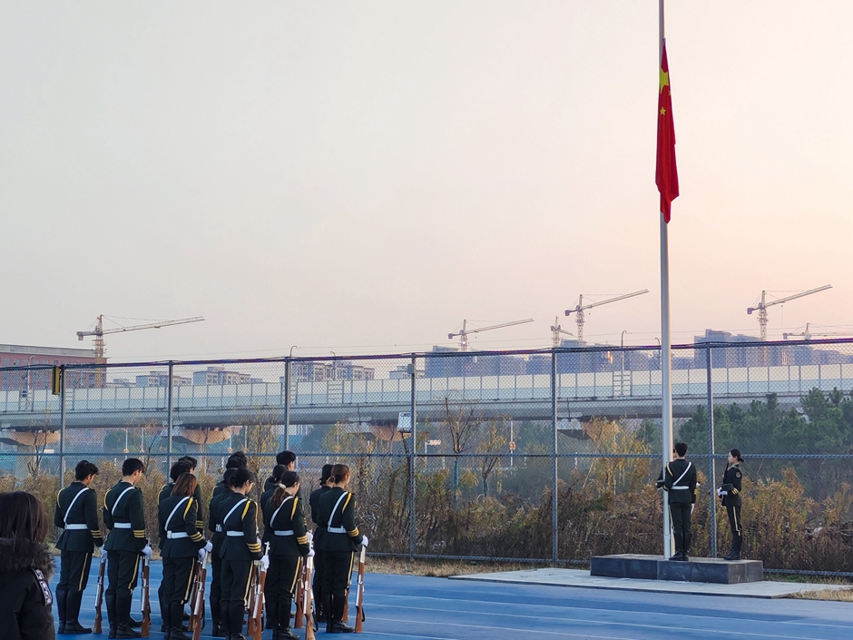 伴随着国歌,升旗手将国旗升至旗杆顶端。现场师生,整齐列队,庄严肃穆,行注目礼并齐声高唱国歌。礼毕后,国旗缓缓下降至旗杆三分之一处,全体默哀三分钟。