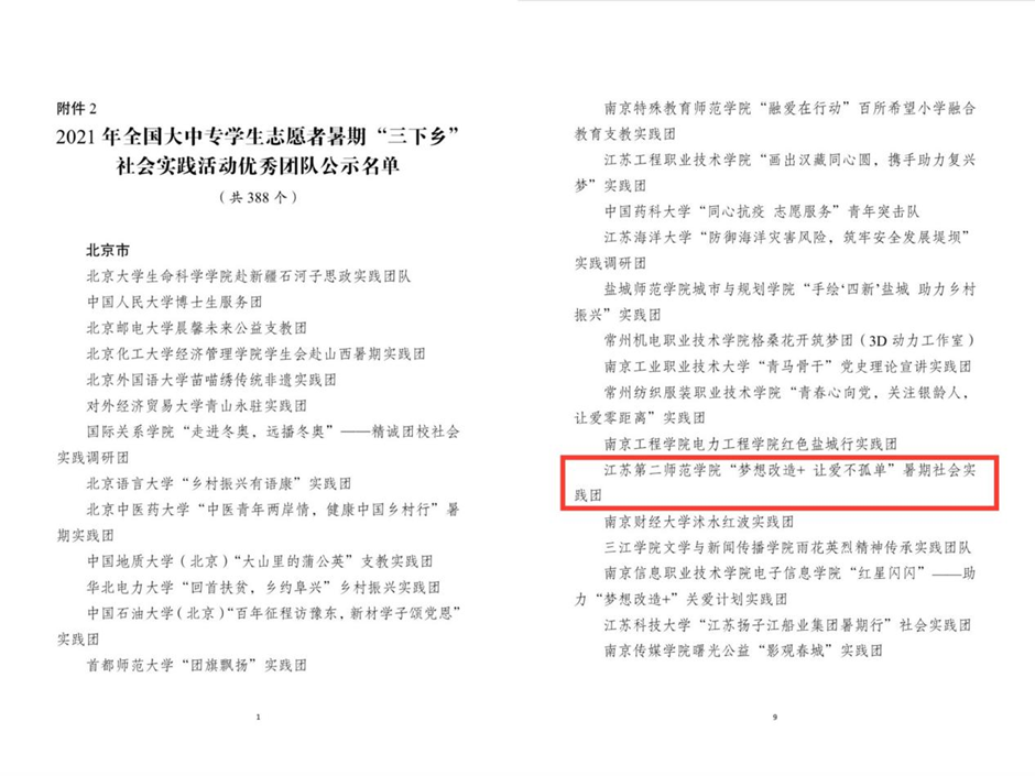 2021年6月,中宣部、中央文明办、教育部、共青团中央、全国学联等部门组织开展2021年全国大中专学生志愿者暑期文化、科技、卫生“三下乡”社会实践活动。我校积极响应号召,精心组织谋划,创新立项模式,以“重走奋斗百年路 青春启航新征程”为主题,广泛开展社会实践,取得了良好效果。近日,团中央青年发展部发布2021年全国大中专学生志愿者暑期“三下乡”社会实践活动总结通报结果,我校“梦想改造+让爱不孤单”暑期社会实践服务团获评全国“三下乡”社会实践优秀团队。在共青团中央主办的“请党放心,强国有我”2021全国大学生“千校千项”网络展示活动遴选中,我校“梦想改造+让爱不孤单”暑期社会实践服务团、青年防疫志愿突击队、steam科创实践团从上万支团队中脱颖而出,获得团队风采奖。由团中央青年发展部举办的2021年全国大中专学生志愿者暑期“三下乡”社会实践“镜头中的三下乡”成果遴选活动中,我校团委获优秀组织单位称号。