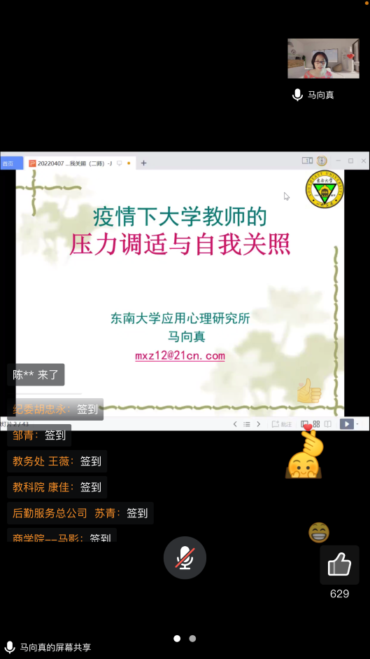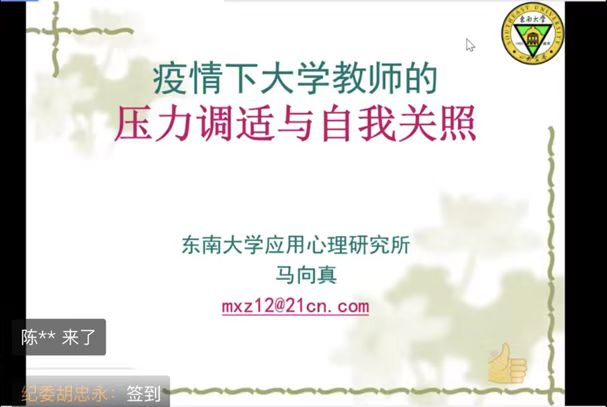 5月4日下午,应党委教师工作部邀请,东南大学应用心理研究所所长马向真教授在线为我校全体教职工作题为“疫情下大学教师压力调适与自我关照”的报告。共计500余名教职工放下繁忙工作,积极参加本次讲座。党委教师工作部部长花书贵主持本次讲座。