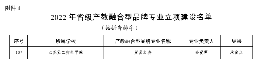 江苏省教育厅5月5日发布《2022年省级产教融合型品牌专业评审结果暨服务外包类专业嵌入式人才培养项目审核结果公示》,我校商学院“贸易经济”专业获批2022年省级产教融合型品牌专业培育点。