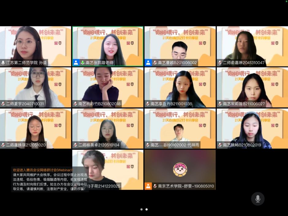 我校与南京艺术学院结合“21天照片打卡”活动,共同举办了本次线上分享会。我校“21天照片打卡活动”,是在“向阳携行 共创未来”的主题下开展的,活动时间从4月23日到5月15日,共吸引了1034名同学的参与,大家通过照片与细腻的文字,记录生活,感悟坚持,发现美好。