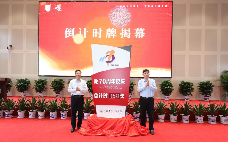 副校长刘贵友发布70周年校庆主题及标识。此次校庆主题为“七秩风华传师道,百年树人谱新章”;校庆标识则由“二师”和“70”等字样组成,昭示了江苏二师七十年来筚路蓝缕、栉风沐雨,始终情系教师教育,不忘传承师道初心的深切情怀和恰是风华正茂的奋斗豪情;展现了江苏二师人站在第二个百年奋斗目标的历史新起点,勇担新时代立德树人根本使命,奋力开启事业高质量发展新篇章的崭新风貌。