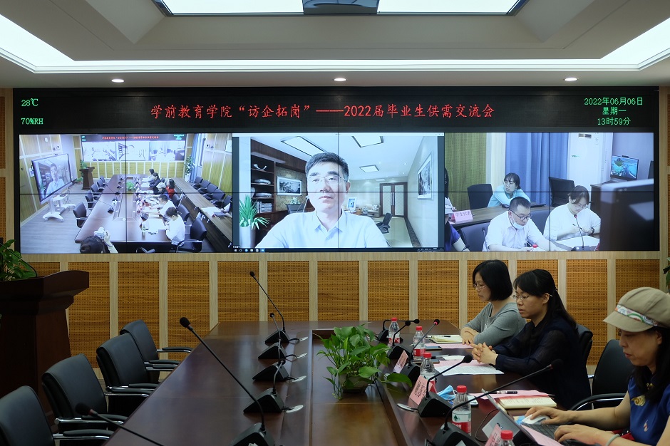 为促进毕业生充分、高质量就业,持续拓展校地、校企合作工作成效,学前教育学院积极搭建线上线下相结合的拓岗平台,推出“云双选”“云宣讲”服务。6月6日下午,学前教育学院在石湫校区举行“访企拓岗”2022届毕业生供需交流会。南京市浦口区教育局、南通市海门市直机关幼儿园、南京鹤鸣幼儿园,江苏抚育安托育机构等四所用人单位应邀开展线上宣讲,副校长徐国华出席会议并致辞,学前教育学院领导班子以及毕业年级百余名学生参加本次交流会。会议由学院党总支副书记王晶主持。