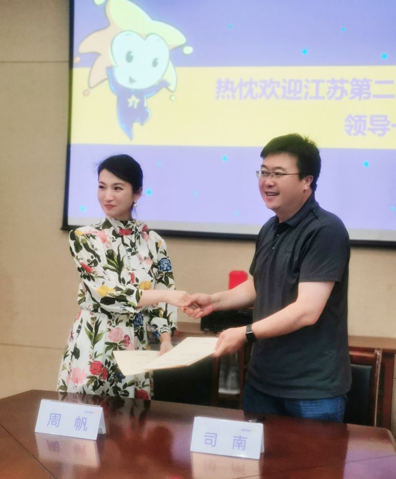 司南与南京小银星艺术团签署《关于共建江苏第二师范学院实习实训基地协议书》,刘继红为南京小银星艺术团授牌。