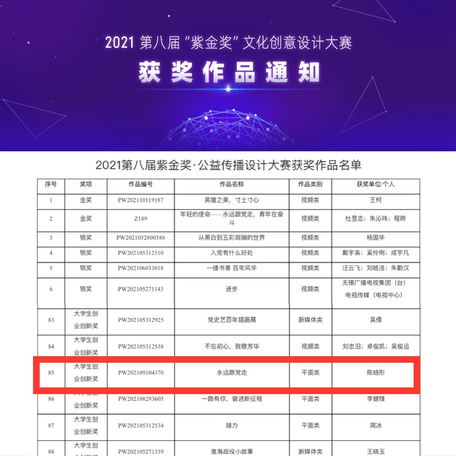 日前,由中共江苏省委宣传部、省文明办、省版权局等18家单位主办,江苏文投集团执行的第八届“紫金奖”文化创意设计大赛发布获奖名单。我校美术学院学生陈姞彤在闫彦老师指导下,喜获大赛大学生创业创新奖。