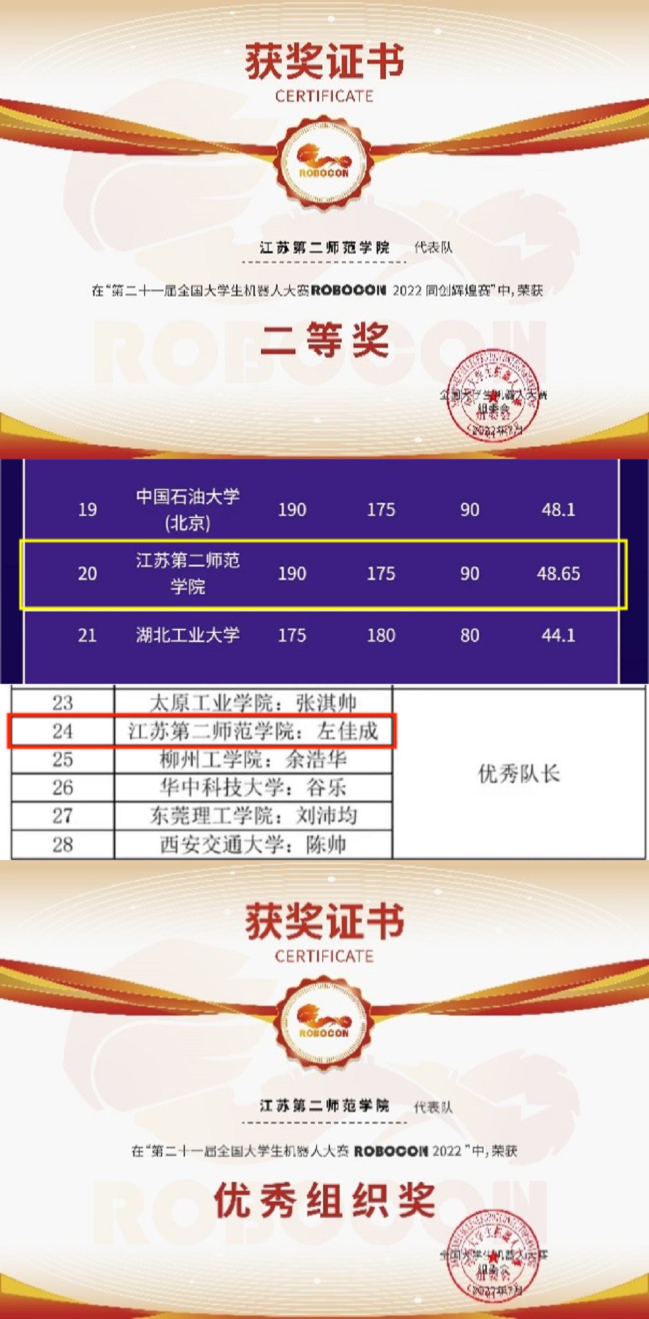 日前,由共青团中央线上主办的第二十一届全国大学生机器人大赛ROBOCON国赛成绩揭晓,我校物理与信息工程学院陈青、顾晓东两位老师指导的机器人团队荣获二等奖(得分列全国第20名),左佳成同学获“优秀队长”荣誉称号,我校获优秀组织奖。
