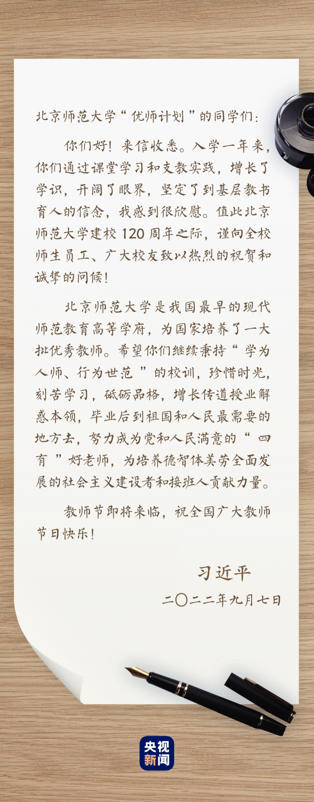 9月7日,在第三十八个教师节来临之际,习近平总书记给北京师范大学“优师计划”师范生回信,向建校120周年的北师大师生员工、广大校友表示祝贺和问候,并向全国广大教师致以节日的祝福。