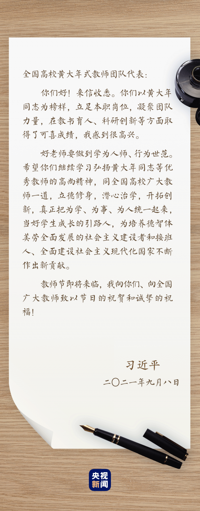 给自己的初中语文老师、给保定学院支教的青年老师、给黄大年式教师团队……多年来,总书记给老师们写了很多封回信,叮嘱牵挂,流淌笔尖。