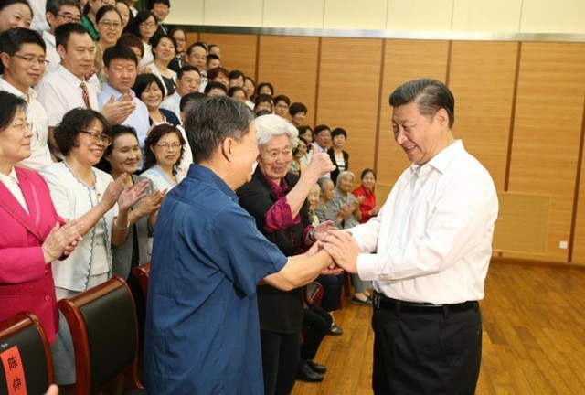 △2016年9月9日,习近平总书记回到北京市八一学校,同陈秋影等几位老师握手交谈。