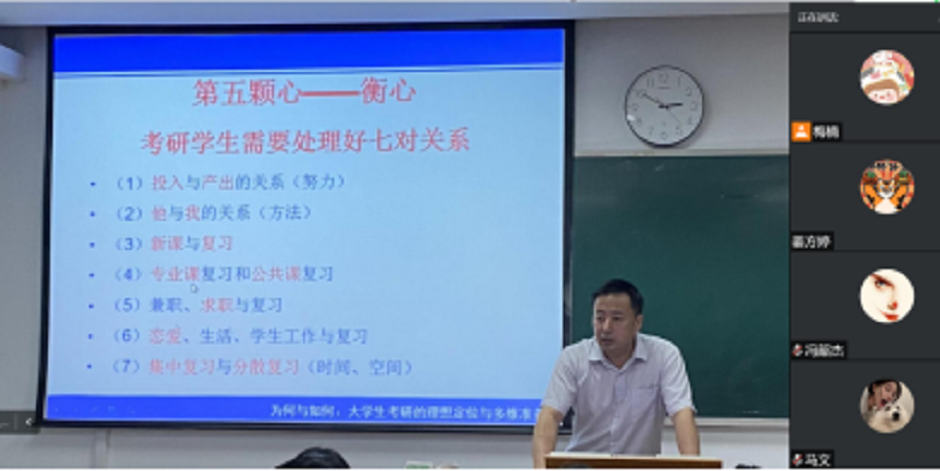 会议伊始,蒋波以考研动因作为切入点,带领学生回顾初心、重拾动力;通过分享自身经历、往届毕业生案例,与学生建立情感共鸣;强调“与其坐着,不如做着”,只有努力、用心,才能成功。随后就冲刺阶段进行复习指导,一是做好心态调试,要有决心、信心、恒心、静心、衡心;二是做好时间准备,要有好每月、每周、每天计划;三是做好知识准备,政治课、英语课、专业课,复习重点心中有数;四是做好心理准备,切忌惰性、侥幸、无谓、押宝、急躁;五是学会总结归纳,题型、学习、应试技巧相互对应。