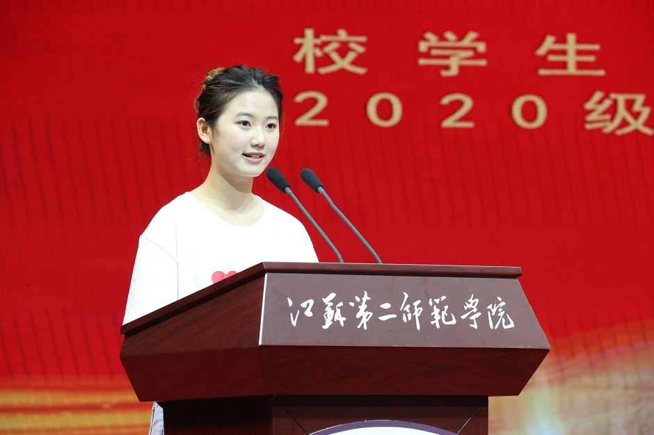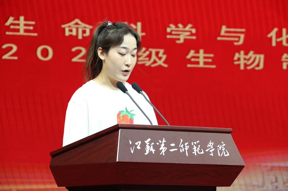 新生代表、地理科学学院2022级地理科学普本(师范定向)班张苑秋同学,生命科学与化学化工学院2022级生物制药专转本班李高璟同学分别发言,他们分享了初次踏进江苏二师校园的感受,希望大家做到立大志、明大德、成大才、担大任,共同创造属于自己和二师的荣耀。