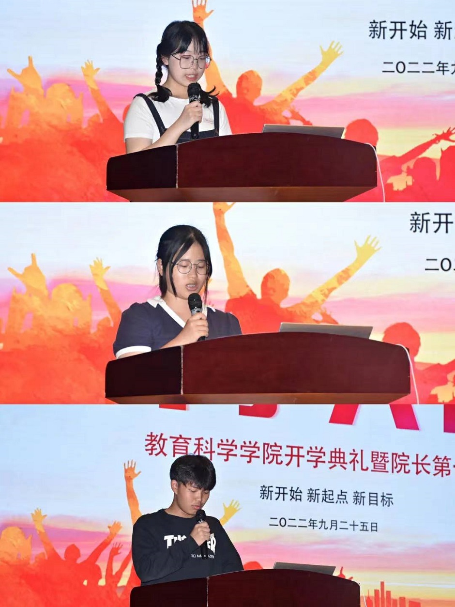 小学教育专业的卜萱蕾、应用心理学专业的高诗雨和教育技术学专业的吴凡作为新生代表,对刚刚落幕的军训做出总结,对未来的学习生活许下期待。更有家长代表以视频形式,为新生送上寄语,为学校送上祝福。