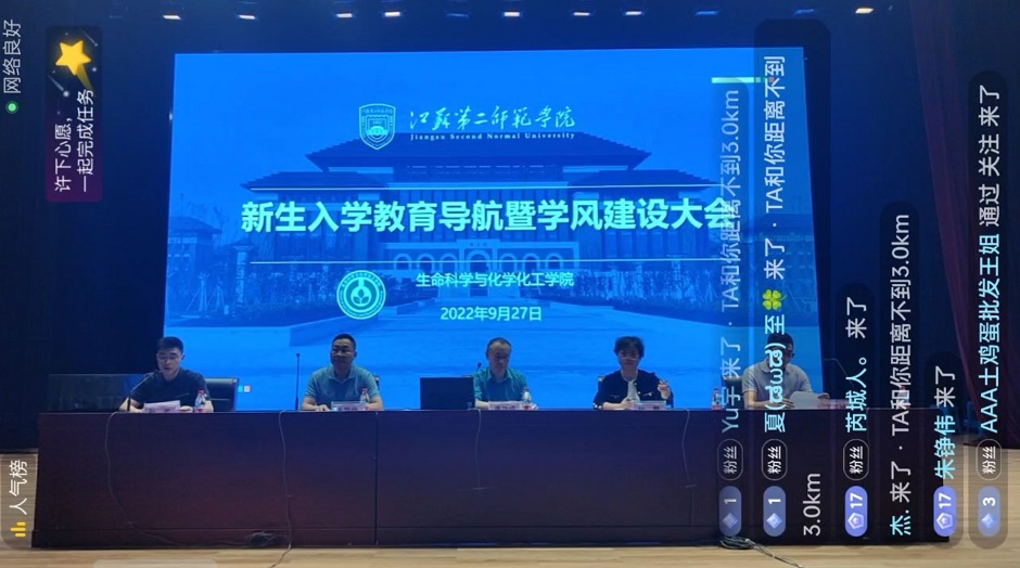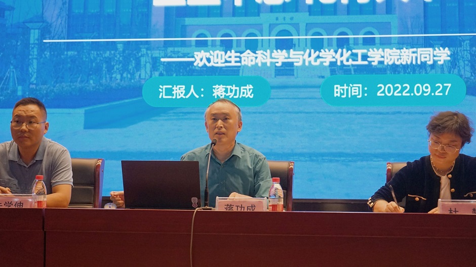为帮助新生加强对学院、专业的了解,更快更好地融入大学生活,鼓励同学们在新环境下努力成为立大志、明大德、成大才、担大任的时代新人,9月27日下午4:30,生命科学与化学化工学院在石湫校区尚美楼报告厅举行2022级新生入学教育导航暨学风建设大会。院长蒋功成,党总支书记朱学伸、副书记孙奕,副院长杜攀、丁正峰,全体辅导员出席大会。本次大会还采用线上同步直播方式,方便转本班及暂缓返校学生观看,线上线下近450人参加。会议由孙奕主持。