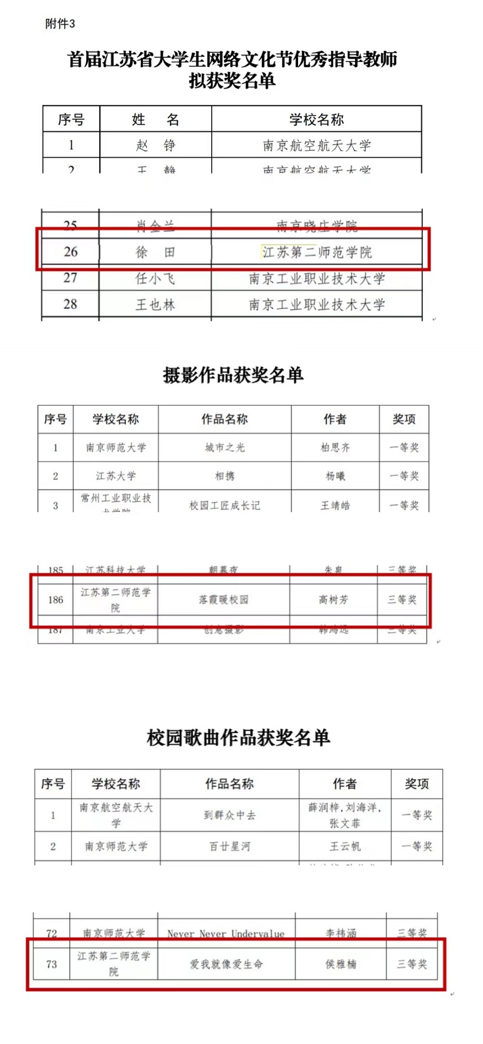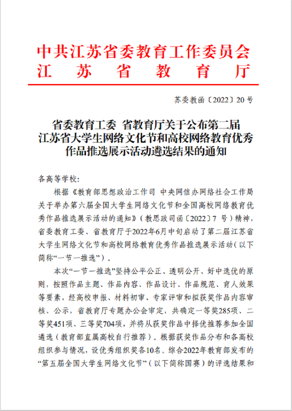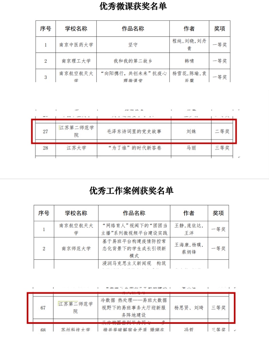 近日,江苏省委教育工委、省教育厅公布第二届江苏省大学生网络文化节和高校网络教育优秀作品推选展示活动获奖结果。我校师生在活动中荣获佳绩,其中二等奖1项、三等奖3项、优秀指导教师荣誉称号1项。