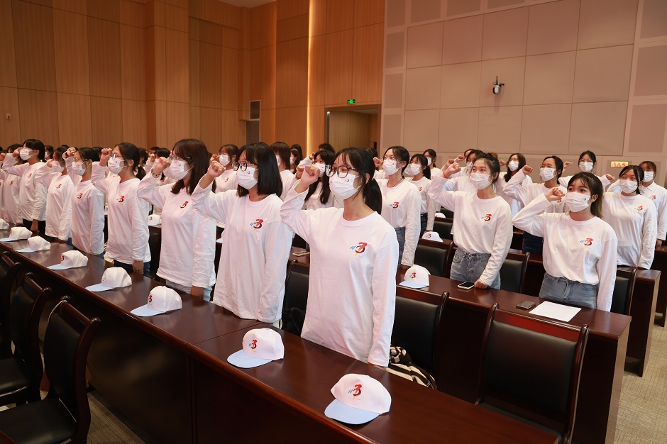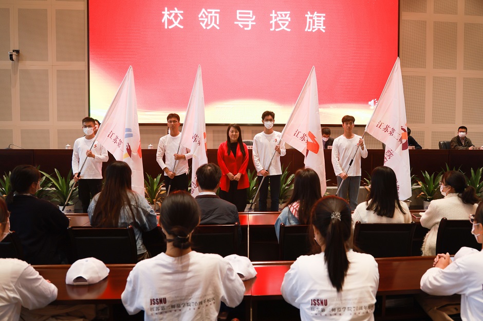校团委书记刘姝宣读《关于成立江苏第二师范学院70周年校庆志愿者服务团队的决定》。刘继红向志愿者代表授予江苏第二师范学院70周年校庆志愿队旗帜,校庆办负责人何磊为代表们佩戴志愿者工作证,校庆志愿者团队队长韩徐越带领全体志愿者宣誓。