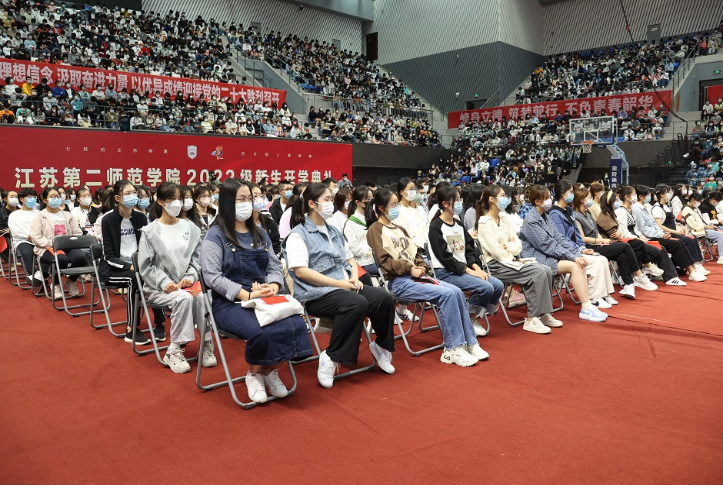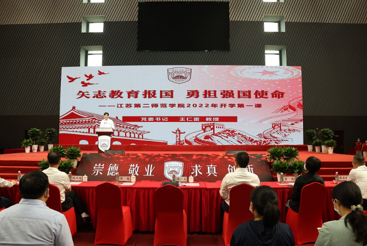 交汇点讯 9月25日上午,江苏第二师范学院2022级新生开学典礼在石湫校区隆重举行。学校利用互联网技术,实现两校区线上线下全程互动。开学典礼后,校党委书记王仁雷为3869名新生讲授了题为《矢志教育报国,勇担强国使命》的开学第一课。其余学生及相关部门、学院负责人分别在石湫校区体育馆主会场和各学院分会场聆听了开学第一课。