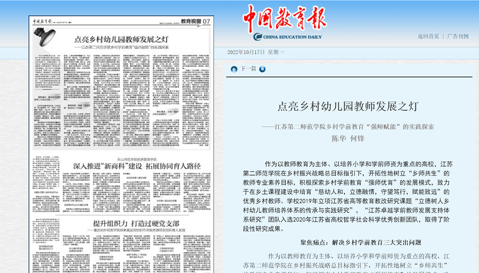 作为以教师教育为主体、以培养小学和学前师资为重点的高校,江苏第二师范学院在乡村振兴战略总目标指引下,开拓性地树立“乡师共生”的教师专业素养目标,积极探索乡村学前教育“强师优育”的发展模式,致力于在乡土课程建设中培育“慈幼人和,立德融情,守望笃行,赋能致远”的优秀乡村教师。学校2019年立项江苏省高等教育教改研究课题“立德树人乡村幼儿教师培养体系的传承与实践研究”,“江苏卓越学前教师发展支持体系研究”团队入选2020年江苏省高校哲学社会科学优秀创新团队,取得了阶段性研究成果。