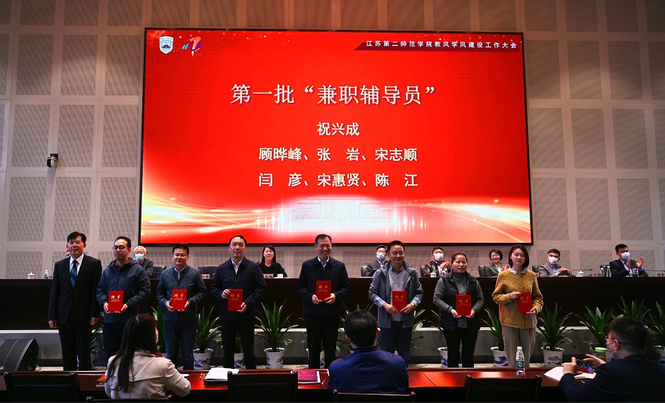 潘文宣读了《关于表彰教风、学风建设工作先进典型的决定》和《关于聘任学校第一批“兼职辅导员”的决定》。王仁雷、王建、祝兴成和崔燕为受表彰个体和集体颁发荣誉证书,并希望受表彰个人和集体再接再厉,充分发挥典型示范作用,为学校教风、学风建设贡献新的力量。王仁雷为第一批“兼职辅导员”颁发聘书,希望他们在今后工作中,继承优良作风,充分发挥自身的岗位优势和专业优势,深入学生中间,关爱学生、指导学生,做好青年学子的“大先生”,不断引领我校人才培养迈上新台阶。