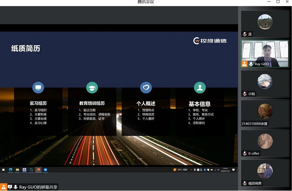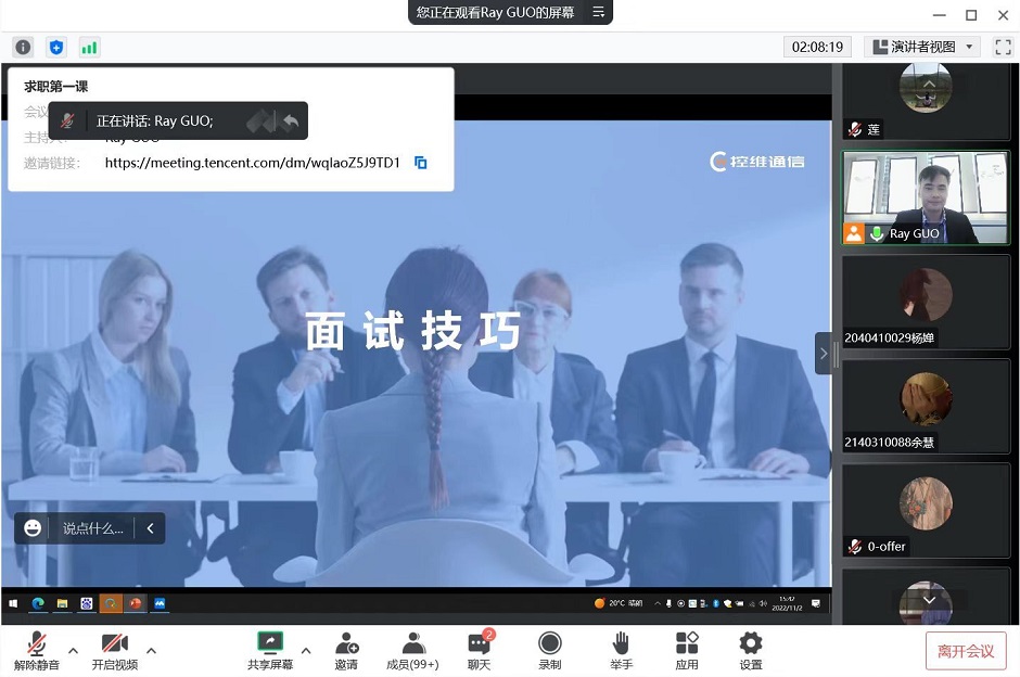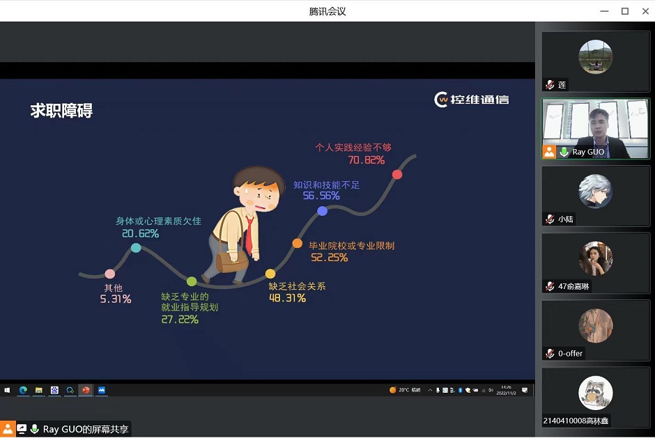 为帮助毕业生熟悉求职流程,掌握求职技巧,切实提高毕业生求职技能,11月2日下午,招就处特邀南京市控维通信科技有限公司人力资源总监郭磊,为毕业生作《求职第一课》线上讲座,讲座由招就处副处长李佶莲主持。
