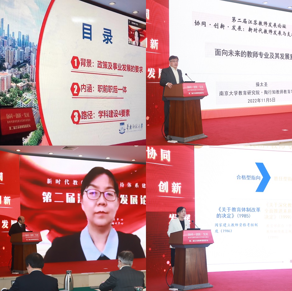 宋磊作《支持教师专业发展 建强基础教育教师队伍》的论坛主旨报告。他指出,党的二十大报告系统描述了当前我国教育工作取得的成绩、存在的问题和未来的努力方向。加快建设高质量教师教育体系,首先要全面理解教师队伍建设的基础地位,领会好总书记的“新师说”,肯定教师的重要作用,明确“好老师”的标准和要求,确立教师队伍建设的战略地位,全面部署教师队伍建设工作,加强教师教育体系建设。他代表青海省教育厅对江苏省对口支援青海教育事业发展表示感谢。