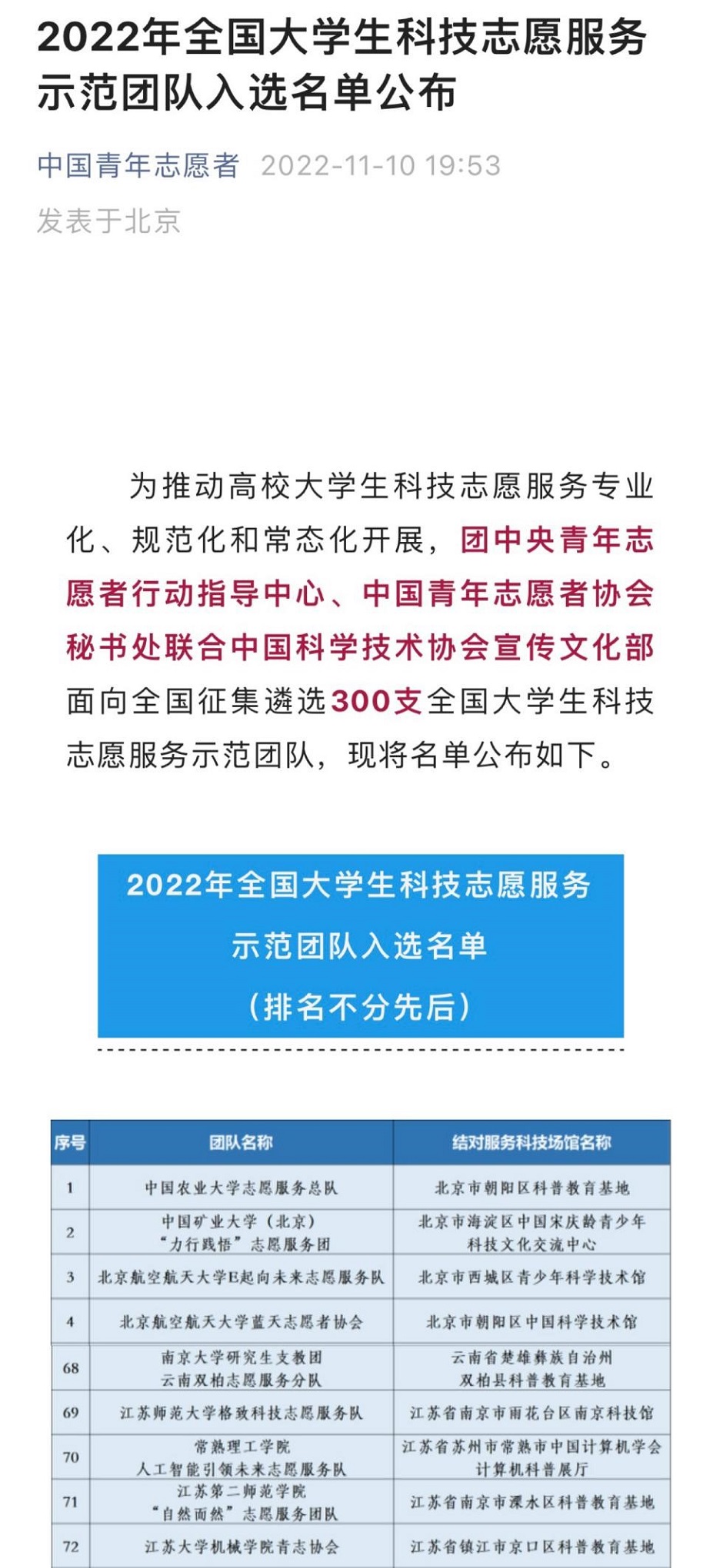 11月10日,2022年全国大学生科技志愿服务示范团队名单公布,我校生化学院“自然而然”志愿服务团队成功入选。本次全国大学生科技志愿服务示范团队遴选活动由团中央青年志愿者行动指导中心、中国青年志愿者协会秘书处、中国科学技术协会宣传文化部联合举办,全国各大高校积极组建团队报名参加,经过层层推选,最终遴选出300支大学生科技志愿服务示范团队。