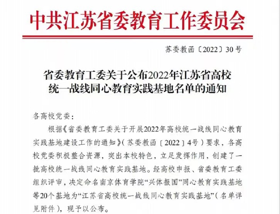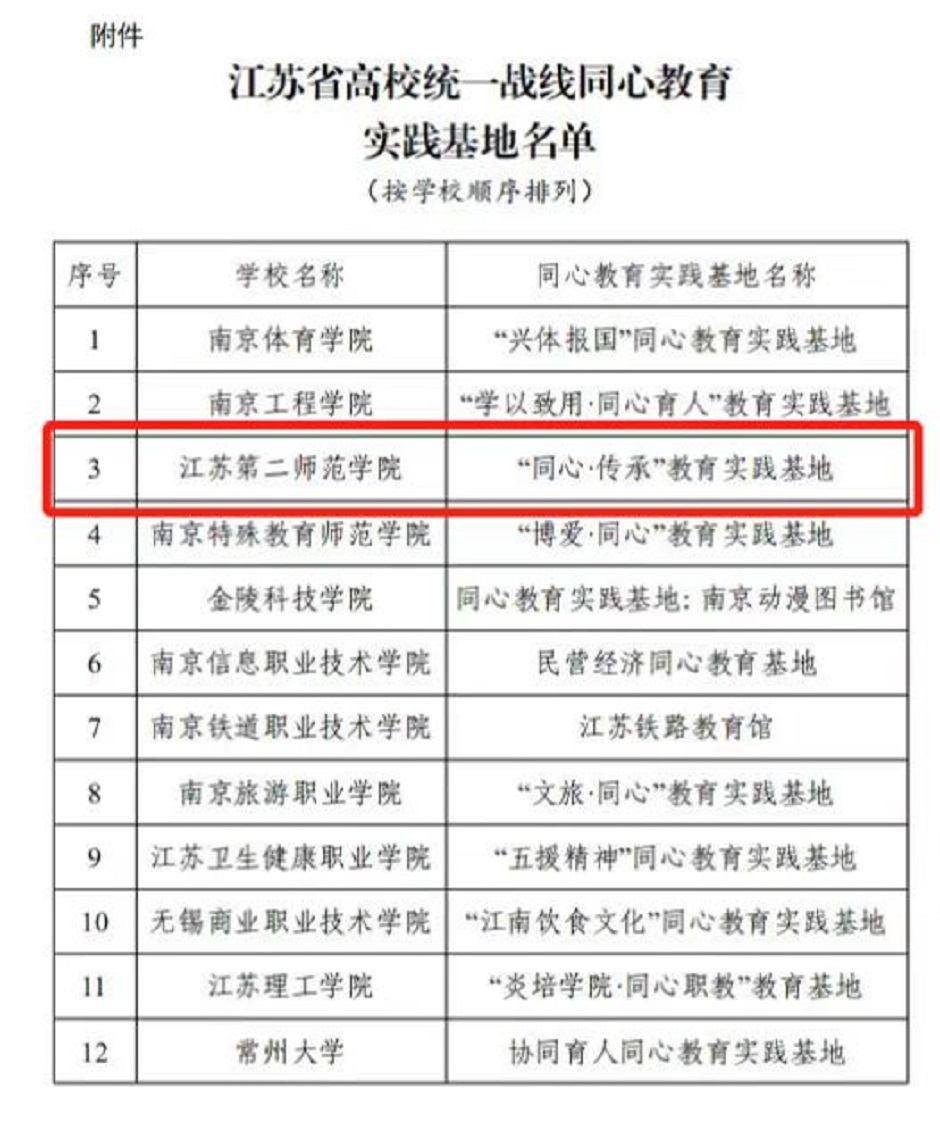 近日,江苏省委教育工委公布2022年江苏省高校统一战线同心教育实践基地名单,经学校申报、专家评审、实地察看、研究审议、网上公示等环节,我校“同心˙传承”教育实践基地成功入选。本次获批的同心教育实践基地共20个,其中本科院校仅10所,此次成功入选标志着我校统战工作再获佳绩。