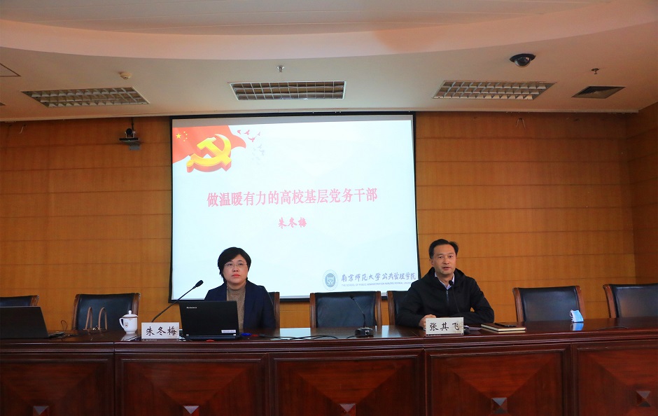 南京师范大学党委委员、公共管理学院党委书记朱冬梅应邀来校作题为“做温暖有力的高校基层党务干部”的专题报告。朱冬梅书记长期从事党建和思想政治教育工作,有着丰富的实践经验,她所在的南京师范大学公共管理学院成功获批首批全国党建工作标杆院系培育创建单位并于2021年顺利通过验收。朱冬梅结合多年的党建工作实践,从做“广大师生的贴心人”“氛围营造的暖心人”“资源整合的有心人”等方面介绍了南师大公共管理学院党建工作的经验。从“固本强基”计划,“五强化五到位”夯实基础工作,加强学院党委“五力”建设以及党支部工作特色等方面生动诠释了学院党委切实履行党建主体责任,遵循“夯实党建基础,彰显党建特色”的工作思路和实例分享。