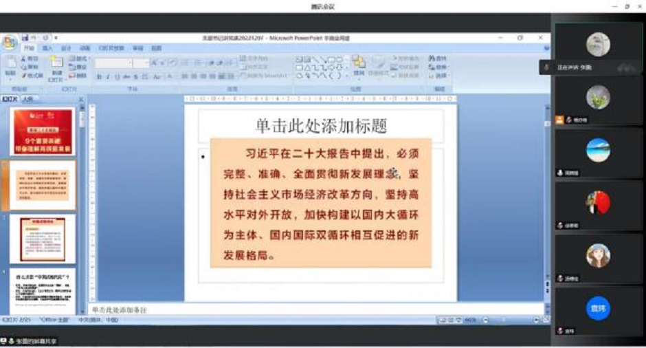 12月7日,地理科学学院教工支部全体党员教师齐集线上,教工支部书记张蕾以“解读二十大报告——深度理解高质量发展”为主题,围绕习近平总书记在二十大报告中提出的“中国式现代化”、“高水平社会主义市场经济体制”、“现代化产业体系”、“共同富裕”、“区域协调发展”等九大名词,结合地理科学学科知识,进行概念解读、澄清认识误区。会后,教工支部教师党员结合专业体会,畅谈了对高质量发展的理解,纷纷表示二十大报告值得细细品读。通过支部书记讲党课,更好地梳理了改革开放四十年发展脉络,明确了未来中国式现代化的发展愿景,理解了中国在世界强国之林的大国担当,党员同志们表示要用自己的双手辛勤劳动,踏实工作,为实现地理科学学院十四五高质量发展贡献自己的一份力量。