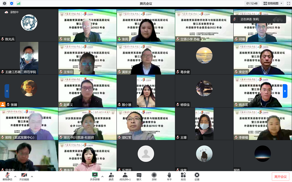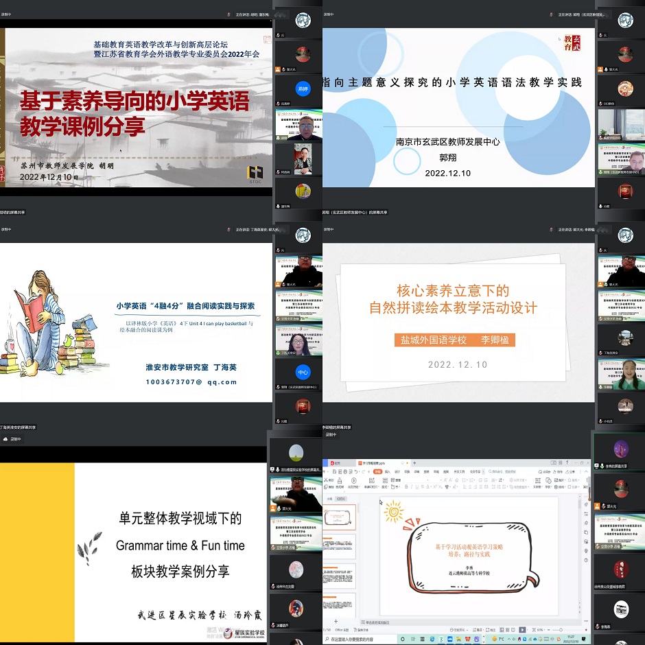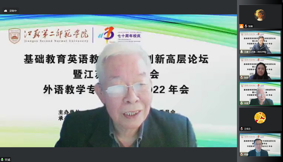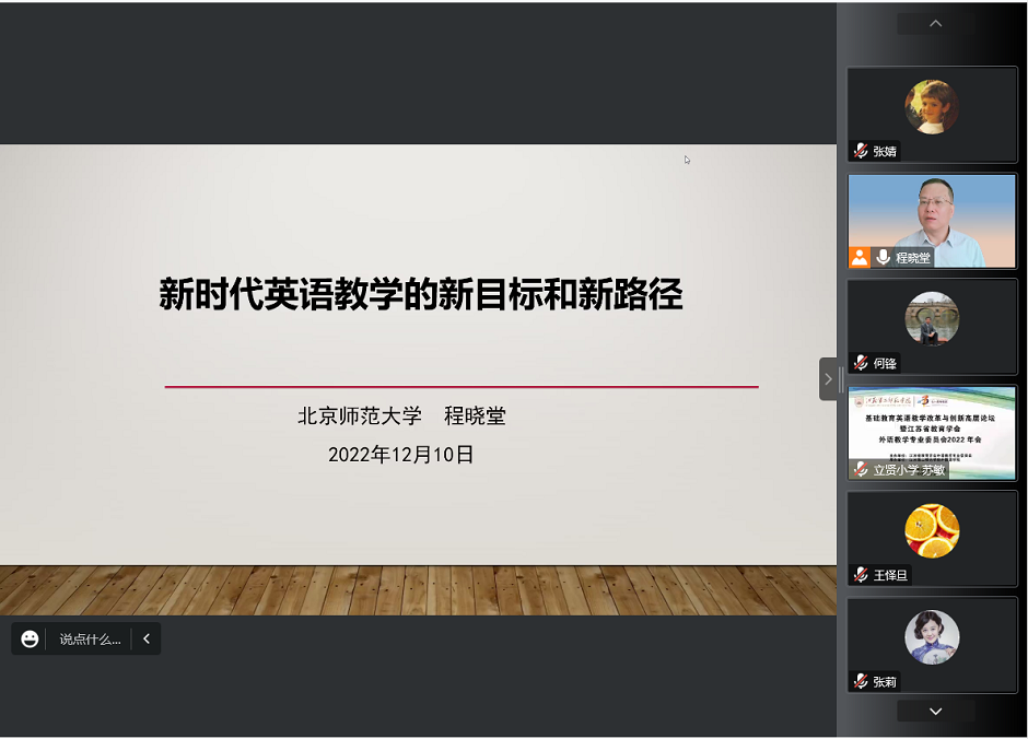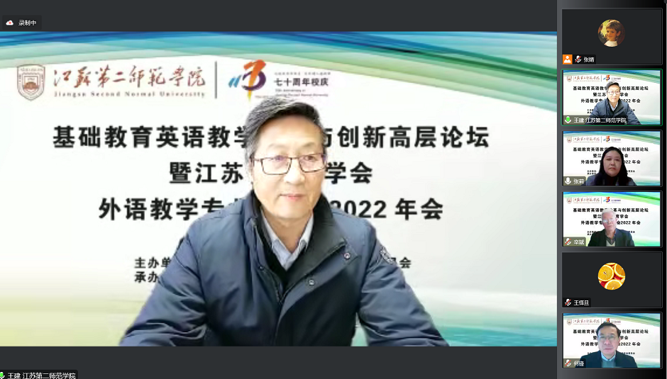 12月9日至10日,由江苏省教育学会外语教学专业委员会主办、江苏第二师范学院外国语学院承办基础教育英语教学改革与创新高层论坛暨江苏省教育学会外语教学专业委员会2022年会通过腾讯会议线上召开,B站同步进行全程直播。来自境内外和全国各地的教育研究专家学者、中小学英语教研员和一线教师以及各高校英语(师范)专业本科生、研究生共计3000余人次相聚云端,共襄盛会。
