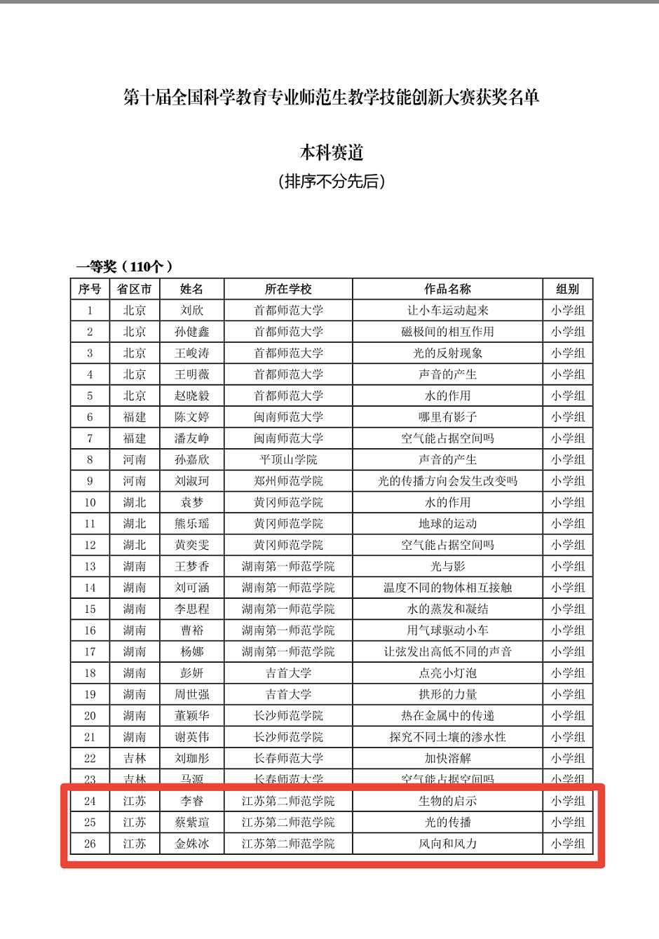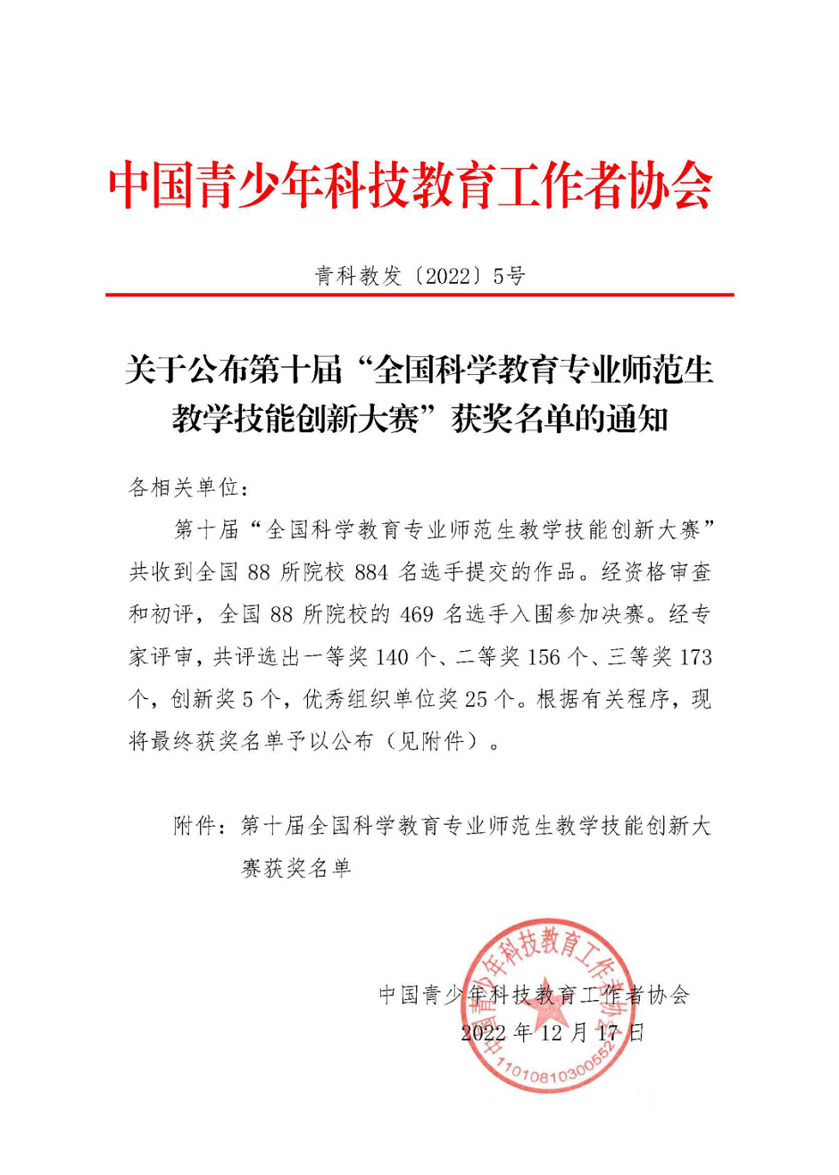12月3日,由中国青少年科技教育工作者协会主办,岭南师范学院和中国青少年科技教育工作者协会科学教师教育专业委员会共同承办的第十届全国科学教育专业师范生教学技能创新大赛决赛(本科赛道)在岭南师范学院举行。本科赛道共有来自64所本科院校706名选手报名参赛,通过对选手的教学设计、微课视频、科技创新教育活动方案等三个方面的初评,共有375位选手进入本科赛道的决赛环节,包括即席演讲、模拟授课、评委提问等三个环节进行线上比赛。经过激烈角逐,评委根据选手初赛和决赛成绩最终评出了本次大赛本科赛道的一等奖110名,二等奖126名,三等奖134名,创新奖4名,优秀组织奖18名。