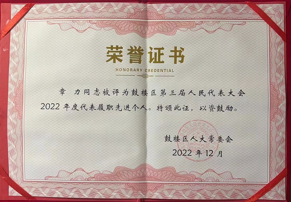 近日,鼓楼区人大常委会授予我校传媒学院章力副院长“2022年度人大代表履职先进个人”称号。