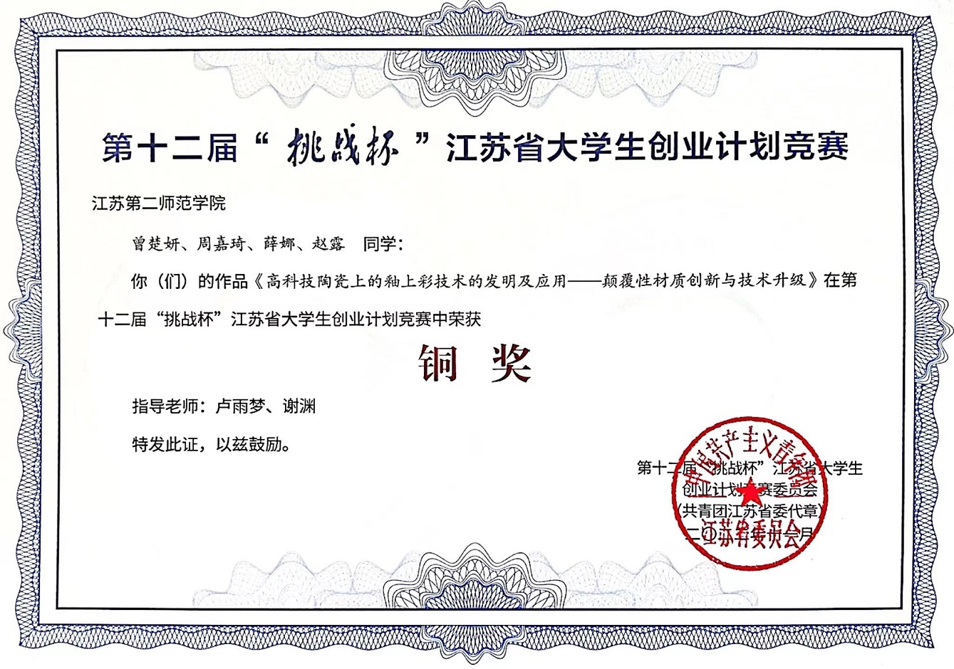 在刚刚结束的第十二届“挑战杯”江苏省大学生创业计划竞赛中,我院学子斩获佳绩,作品“高科技陶瓷上的釉上彩技术的发明及应用——颠覆性材质创新与技术升级” 荣获铜奖。本届竞赛吸引了全省高校50余万人的关注,超10万个项目参赛,学校、学生的数量以及作品的数量,均创历届之最。江苏省218所高校的662件作品进入了省级初赛,经过预赛网评选拔,129所学校的373件作品入围决赛,江苏二师美术学院的作品最终突围决赛,荣获铜奖。