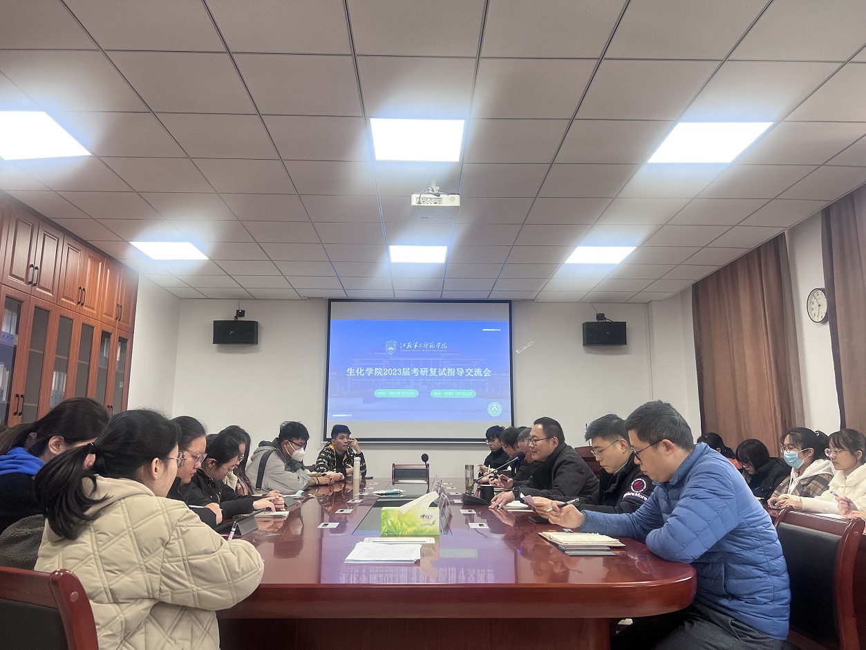 2月24日,生化学院召开2023届考研复试指导交流会,院长蒋功成,院党总支书记朱学伸,副院长杜攀,党总支副书记孙奕及2023届需参加考研复试及调剂的学生参加本次会议。会议由院学工办主任董伟伟主持。