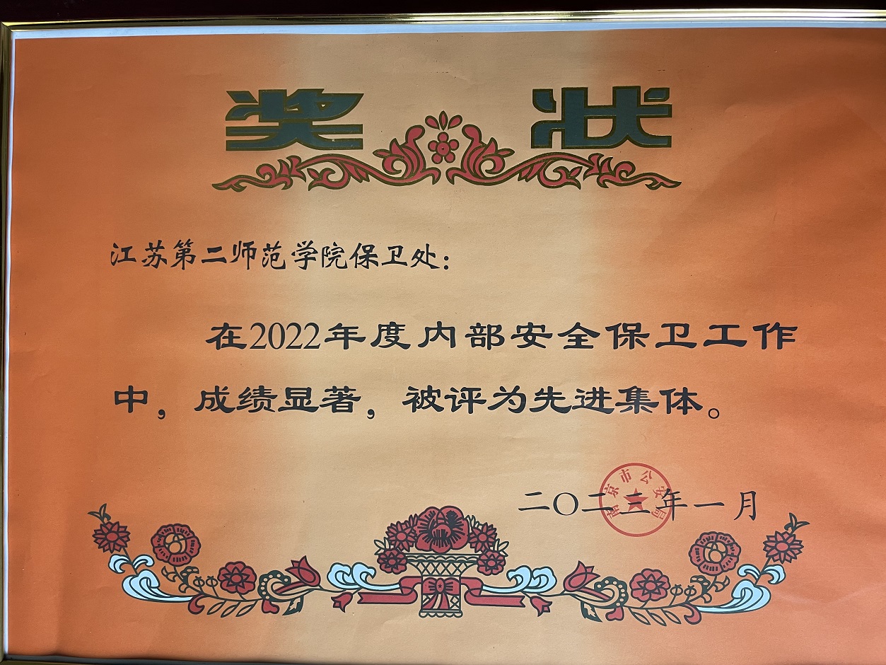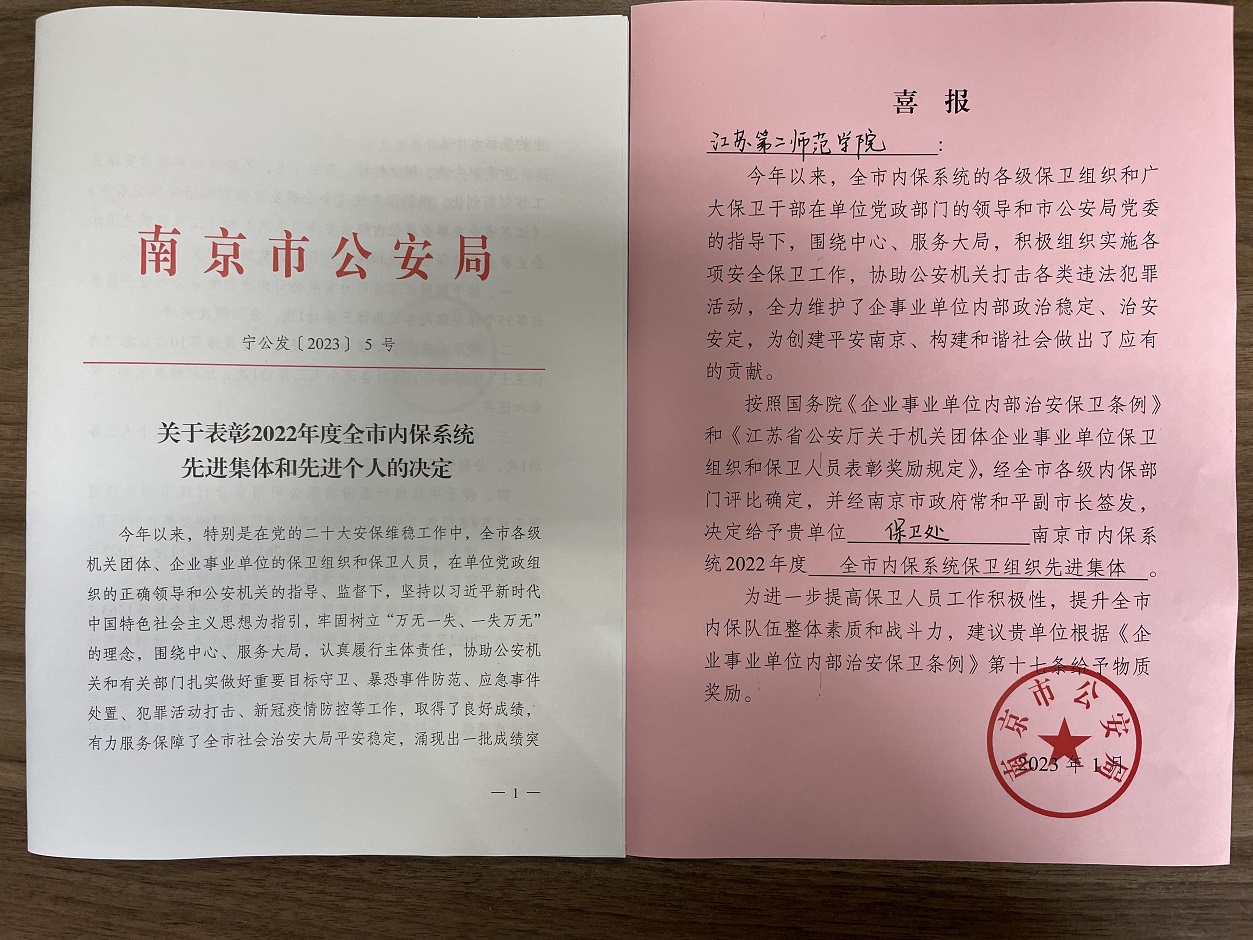 近日,由南京市政府常和平副市长签发、南京市公安局发布《关于表彰2022年度全市内保系统先进集体和先进个人的决定》,我校保卫处因在校园安全保卫工作中成绩突出,获评“2022年度全市内保系统保卫组织先进集体”,王建宏同志被评为“2022年度全市内保系统保卫组织先进个人”。