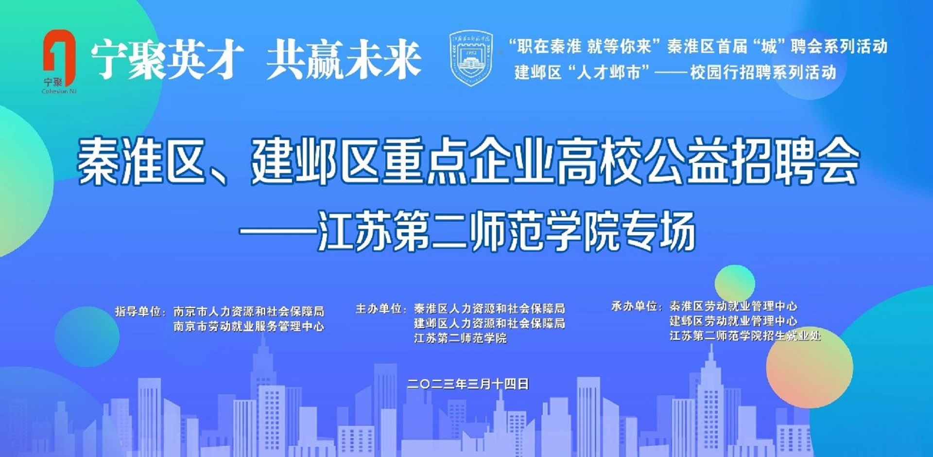 为及时把握春招先机,搭建高校毕业生与企业供需平台,3月14日下午,我校招生就业处联合南京市秦淮区人力资源和社会保障局、建邺区人力资源和社会保障局,于草场门校区体育馆举办“秦淮区、建邺区重点企业高校公益招聘会——江苏第二师范学院专场”招聘会,招就处处长司南、副处长李佶莲全程参与此次活动。本次招聘会为秦淮区首届“城”聘会、建邺区“人才邺市”校园行招聘系列活动之一,是秦淮区、建邺区两区首次联合与我校合作,为促进我校毕业生高质量就业开辟了新渠道。